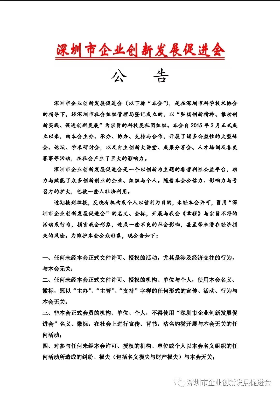 深圳市(shì)企業創新發展促進會是一(yī)個以創新為(wèi)主題的(de)非營利性公益平台,助力與賦能了衆多創新創業的(de)企業、組織與個人。随着本會公信力、影響力與号召力的(de)擴大,也被一(yī)些人非法利用。