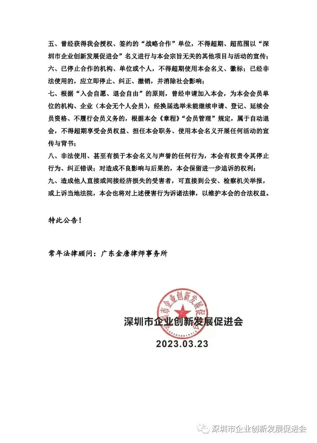 五、曾經我會授權、簽約的(de)“戰略合作”單位屆滿未能延續的(de),不得超期、超範圍以“深圳市(shì)企業創新發展促進會”名義進行(xíng)與本會宗旨無關的(de)其他項目與活動的(de)宣傳與背書;