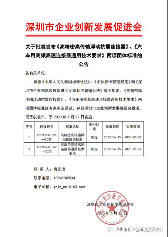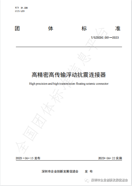 6月15日,深圳市(shì)企業創新發展促進會通過國(guó)家标準信息平台向行(xíng)業發布了T/SZECDC 001—2023《高(gāo)精密高(gāo)傳輸浮動抗震連接器》團體标準,2023年(nián)6月22日正式實施。