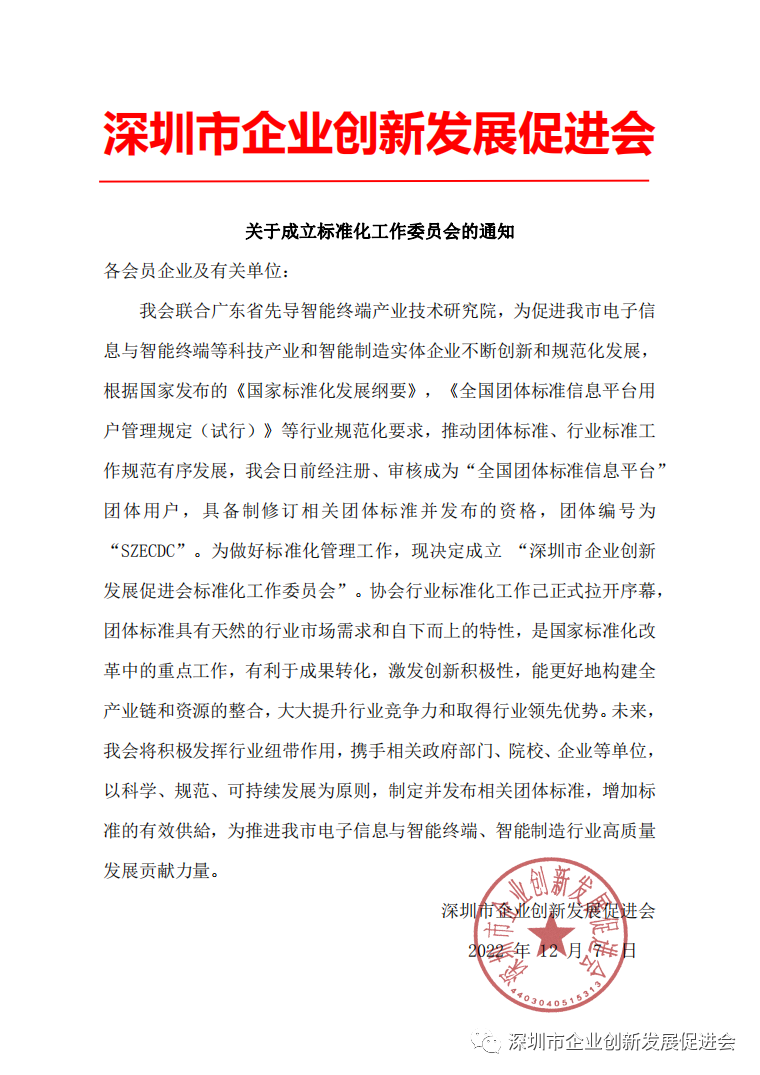 為(wèi)做(zuò)好标準化管理(lǐ)工作,我會決定成立 “深圳市(shì)企業創新發展促進會标準化工作委員會”,并聯合廣東省先導智能終端産業技術研究院共同推進協會行(xíng)業标準化工作。