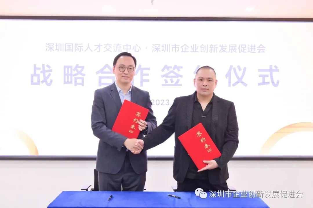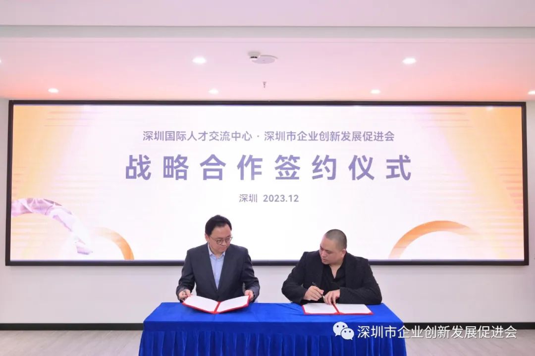 深圳國(guó)際人才交流中心主任李海、深圳市(shì)企業創新發展促進會會長(cháng)黃立代表雙方正式簽字。